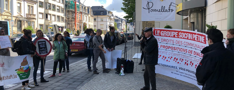 Une action de solidarité avec les communautés affectées par les plantations de SOCFIN en Afrique et en Asie a été menée au Luxembourg ce 28 mai durant l’Assemblée générale de la multinationale. Une dizaine d’activistes ont directement participé à l’AG pour dénoncer ses agissements et réclamer des actions immédiates : « l’engagement volontaire des multinationales ne mène nulle part. Les États doivent adopter des lois pour réguler ces entreprises basées en Europe » explique Marine Lefebvre qui a participé à l’action pour les ONG luxembourgeoises. Le même jour, des ONG suisses se sont mobilisées devant les nouveaux bureaux de SOCFIN délocalisés à Fribourg en relayant le message : « SOCFIN, we are watching you ! ».
